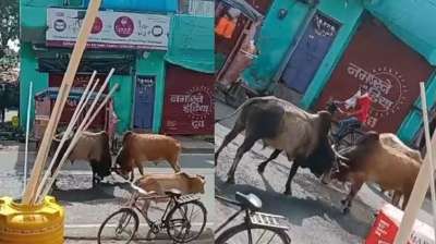 सड़क से घर तक पहुंची सांड़ों की जंग, गेट पर खड़ी महिलाओं को छूकर निकल गए