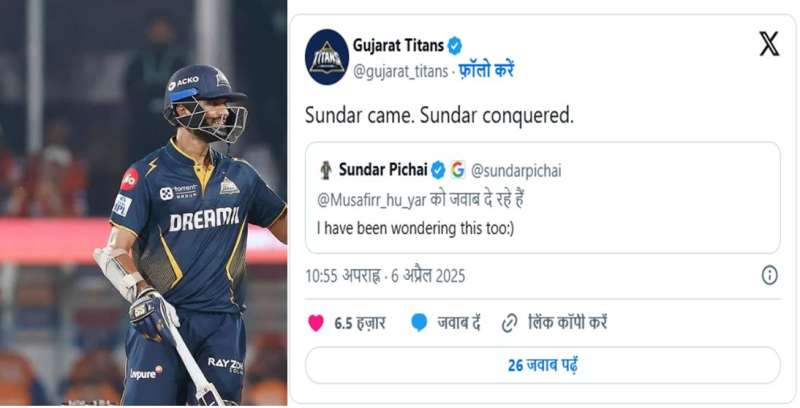 रविवार को वॉशिंगटन सुंदर IPL 2025 में अपना पहला मैच खेल रहे थे. पंजाब किंग्स के खिलाफ हुए टीम के पहले मैच में सुंदर नहीं खेले थे. जिसको लेकर एक यूजर ने पोस्ट किया था और लिखा था कि, "वॉशिंगटन सुंदर टीम इंडिया के 15 खिलाड़ियों में कैसे शामिल हो जाते हैं, जबकि 10 टीमों के होते हुए भी उन्हें किसी भी IPL एकादश में जगह नहीं मिलती, यह एक रहस्य है." इस ट्वीट पर प्रतिक्रिया देते हुए सुंदर पिचाई ने लिखा था कि, "मैं भी यही सोच रहा था." आपको बता दें कि 2017 से IPL खेल रहे वॉशिंगटन सुंदर सिर्फ 2 ही सीजन में 10 से अधिक मैच खेल पाए हैं. सुंदर पिचाई के ट्वीट का जवाब देते हुए गुजरात टाइटंस ने लिखा, "सुंदर आए और सुंदर जीते."